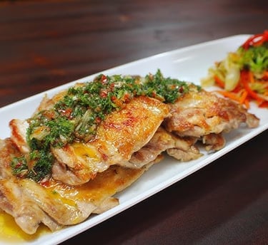 Delicioso corte de pollo a la parrilla, marinado y jugoso, servido con guarniciones.