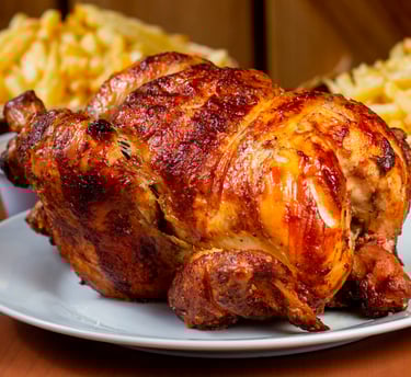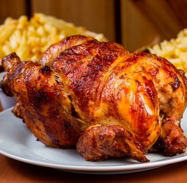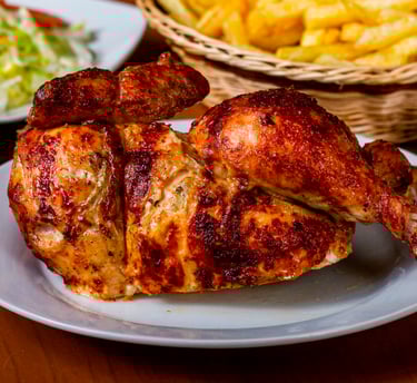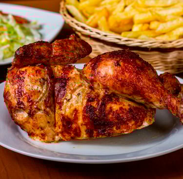 Pollo entero asado a la brasa, con su piel dorada y crujiente, ¡una delicia!