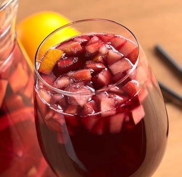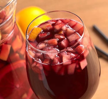 Refrescante copa de sangría, llena de frutas frescas y sabores vibrantes.