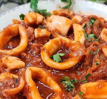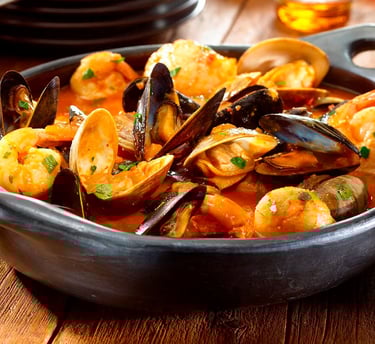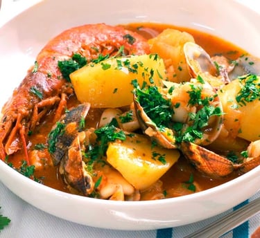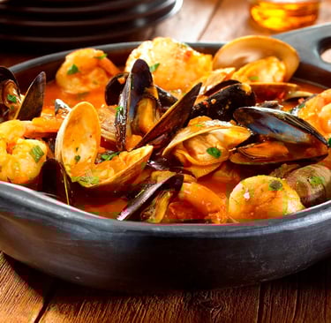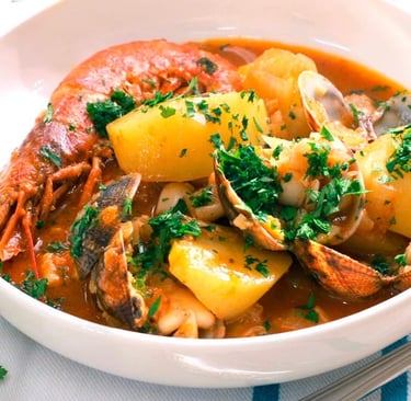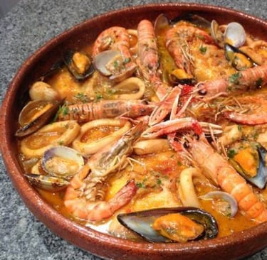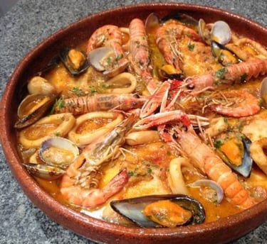 Surtido de mariscos en un sabroso guiso, lleno de sabores del mar.