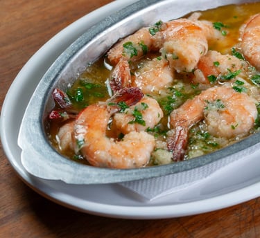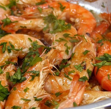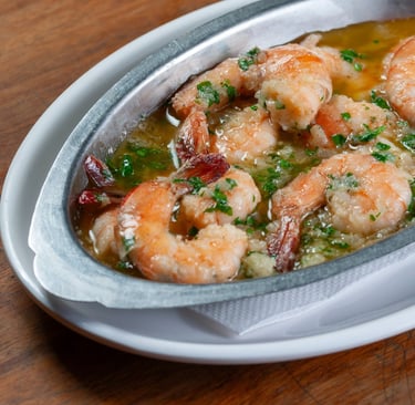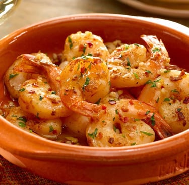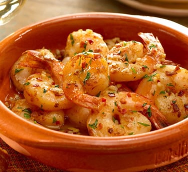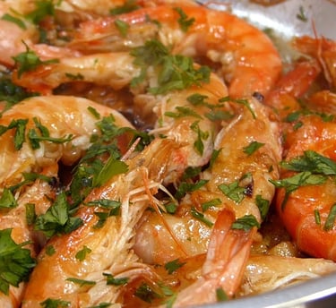 Camarones salteados en ajo y aceite de oliva, con un toque de perejil fresco.