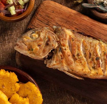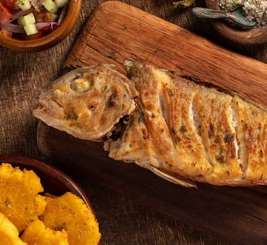 Robalo entero frito, crujiente y sabroso, ideal para compartir.