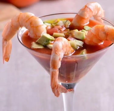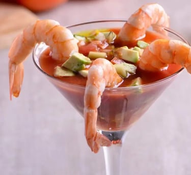Camarones frescos en salsa de tomate y aguacate, servido frío y refrescante.