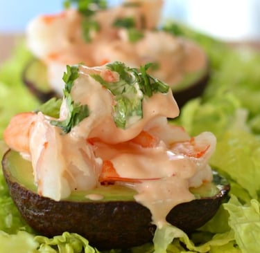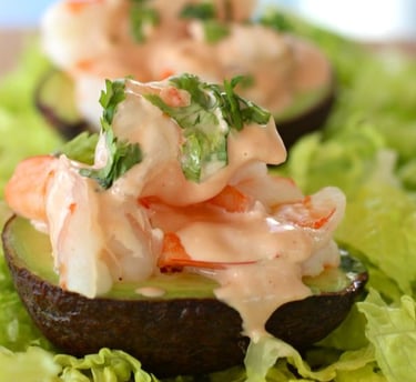 Aguacate relleno de camarones, aderezado con una suave salsa de limón.