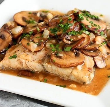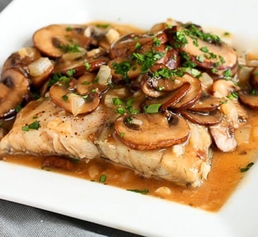 Suave pescado cocido en un guiso con verduras, lleno de sabor.