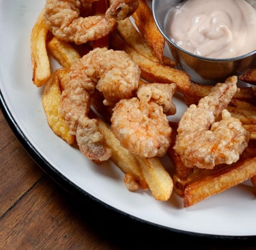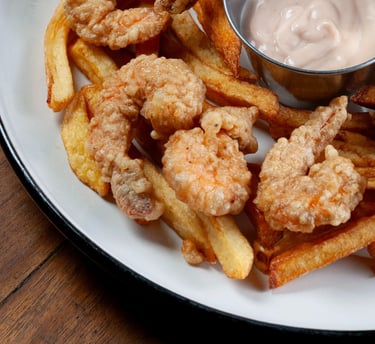 Camarones empanizados y fritos, crujientes por fuera y tiernos por dentro.