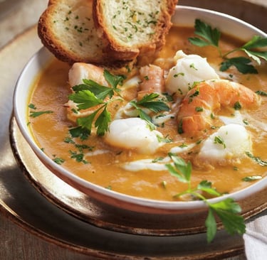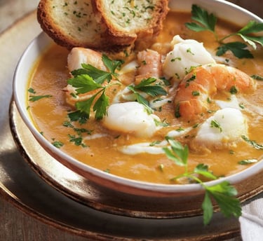 Rico caldo con mariscos frescos y hierbas, un festín del océano en cada cucharada.