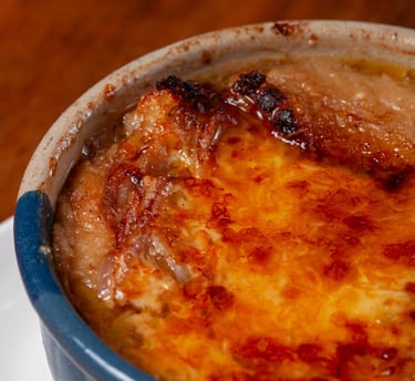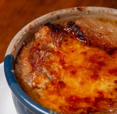 Cebollas caramelizadas en caldo de res, gratinada con queso derretido.